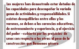 Por otro, las mujeres han demostrado estar dotadas de las capacidades necesarias que las acreditan para desempeñar la variada gama de actividades y responsabilidades generadas por una división social del trabajo cada vez más diversa. Si existen desequilibrios entre ellas y los varones, se deben a las carencias educativas, de entrenamiento y experiencia, y sobre todo al ejercicio del poder –cubierto por los prejuicios- de unos con respecto a las otras: al peso de la construcción que llamamos género.