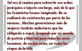 Tal vez el camino para subvertir ese orden jerárquico e injusto sea largo, más de lo que las feministas hemos imaginado. Está demostrado que no se realizará sin resistencias por parte de los varones. Éstas pueden llegar a revertir la tendencia ascendente de estos últimos cuarenta años y sumir en la aparente parálisis durante varias décadas. Como consuelo, asegura que muchas generaciones más de mujeres se encontrarán con malestares que las obligarán a seguir bregando por un mundo de justicia y libertad para todos los seres humanos, de ambos sexos en todas las etapas de la vida. Al final de cuentas, la lucha por la justicia y la libertad no tiene fin.