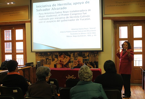 La Dra. Rosa María Valles Ruiz destacó la figura de Hermila Galindo, maestra, feminista y política, en la realización de los dos primeros encuentros feministas en México, y quien apoyaba la emancipación de las mujeres a través de la educación y su participación política.