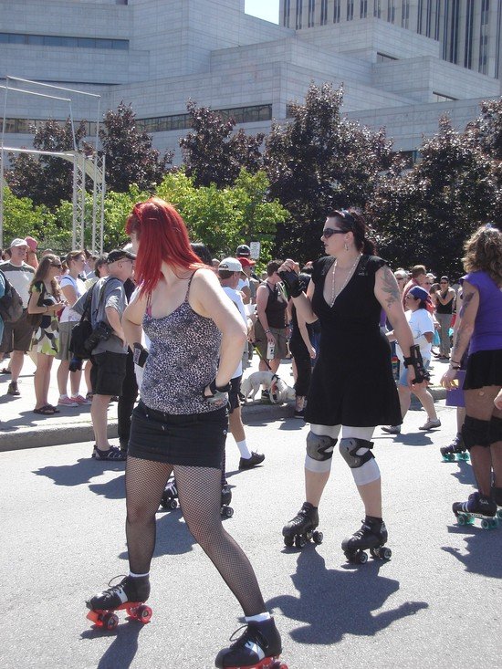 Pero no nos equivoquemos: su estética contradice la esperada apariencia "femenina", aquella de la chica dulce, vestida en rosa pastel, dócil y apacible. Sí, a las rollergirls les gusta muchas veces el color rosa; pero parece gustarles porque pueden usarlo en sus cuerpos multiformes con libertad y soltura. La corporalidad del juego nos muestra a chicas sumamente atléticas, pero de figuras disímiles: espigadas, altas, bajas, robustas, patichuecas, jóvenes, no tan jóvenes, cuadradas, tatuadas, bien peinadas, despeinadas, brazos firmes, piernas guangas. Todas son diferentes, pero las une su rechazo a encajar en el molde imperante de la mujercita bella, delicada y sumisa. El roller derby es un espacio que permite que una jugadora entre a la cancha dejando ver su panza abultada con un letrero haciendo referencia a su propio vello púbico. Su ingeniosa osadía recuerda los vientres pintados de muchas mujeres que se han expresado en público diciendo "este cuerpo es mío". Las patinadoras usan shorts cortísimos, sin importar que las lonjas se les salgan de lado. La ropa que se anuncia incesantemente en la tele no es solamente para las súper modelos que le hacen propaganda, sino también para ellas, las mujeres de carne y hueso que forjan una relación diferente con sus cuerpos.