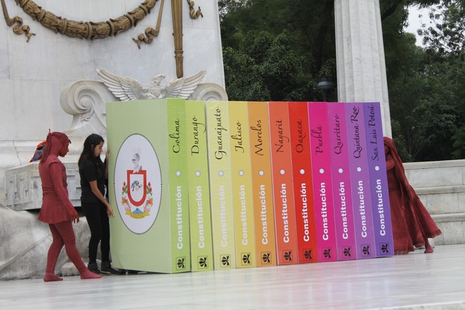 México, D.F. /MujeresNet.- Representaciones enormes de las constituciones de 17 estados de la República se abren ante el público para mostrar a mujeres encarceladas por interrumpir su embarazo, en una escena que formó parte del performance feminista, organizado y realizado en el Hemiciclo a Juárez el 25 de septiembre de 2015 por la Red por los Derechos Sexuales y Reproductivos en México (ddeser), con el que se exige la legalización del procedimiento en esos estados.