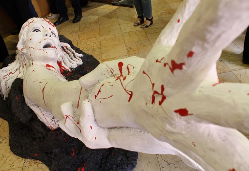 Cerca de la puerta del recinto se colocó en el suelo la figura de una mujer como si estuviera saliendo del piso, obra de la Glenda Hecksher, quien explicó que los feminicidios y la violencia hacia las mujeres de todas las edades motivaron su escultura, la cual representa a todas las mujeres de todas las edades.