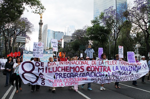 Con batucadas, las manifestantes recorrieron avenida Reforma hasta llegar al Zócalo capitalino por la calle 5 de mayo. Sin pausa gritaron consignas como "¡Mujeres contra la guerra, mujeres contra el capital, mujeres contra el machismo y el terrorismo neoliberal!".